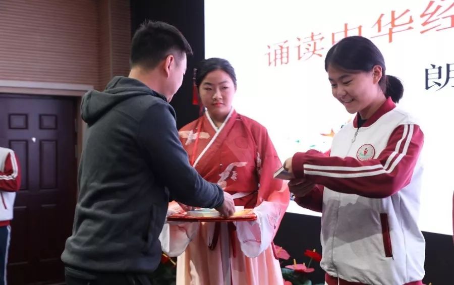 同学们以读诵、合诵为主要形式,或附加动听的背景音乐,或弹传统乐器琵琶伴奏,或借助古朴素雅的古装诵读。